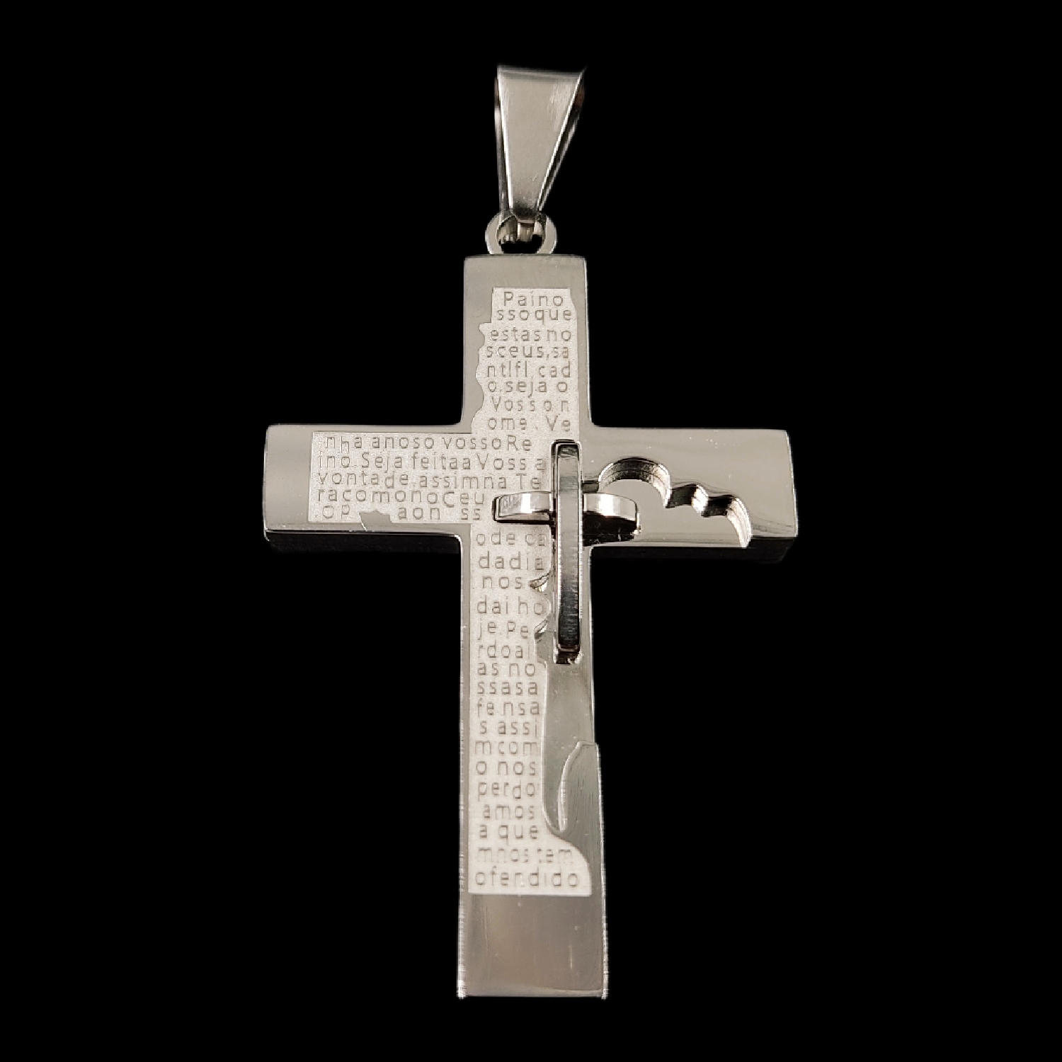 Modelo: Pingente Crucifixo com Pai Nosso Alto Relevo Banhado a PRATA 925